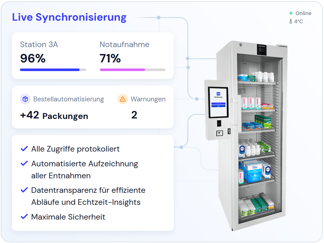 Die Plattform vernetzt intelligente Medikamentenschränke mit Echtzeitdaten und klinischen Systemen, erfasst jede Entnahme lückenlos und automatisiert die Steuerung klinischer Workflows. Dadurch werden Fehlerquellen reduziert, Therapien präzise unterstützt und die Patientensicherheit nachhaltig erhöht.
